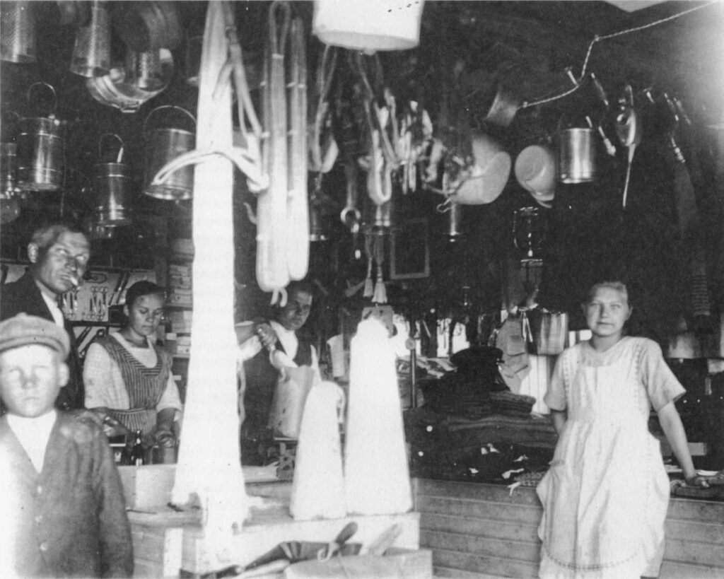 Janne Kalinin sekatavarakauppa 1920-luvulla. Kauppias kuvan vasemmassa reunassa.